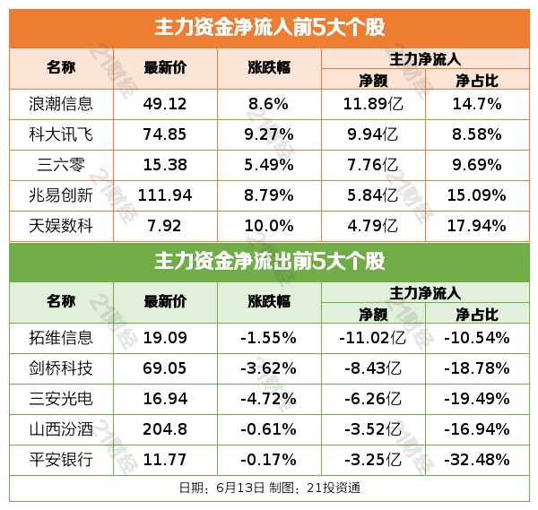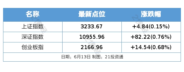 6月13日大盘全天震荡反弹,三大指数均小幅上涨,深成指领涨,沪指录得5连阳。截至收盘,沪指涨0.15%,深成指涨0.76%,创业板指涨0.68%。盘面上,AI概念股反复活跃,其中算力概念股午后集体走强,亚康股份、大为股份、南兴股份、城地香江等涨停;天娱数科、传智教育、岭南股份、慈文传媒等涨停,科大讯飞涨超9%再创历史新高。新能源车产业链个股继续活跃,迪生力、飞龙股份、联明股份等多股连板。特高压、电网概念股一度冲高,奥特迅、国电南自、航天晨光等涨停。下跌方面,医药股陷入调整,国药股份、千金药业跌超5%。总体上个股涨多跌少,两市超2500只个股上涨。沪深两市成交额9423亿,较上个交易日缩量231亿。