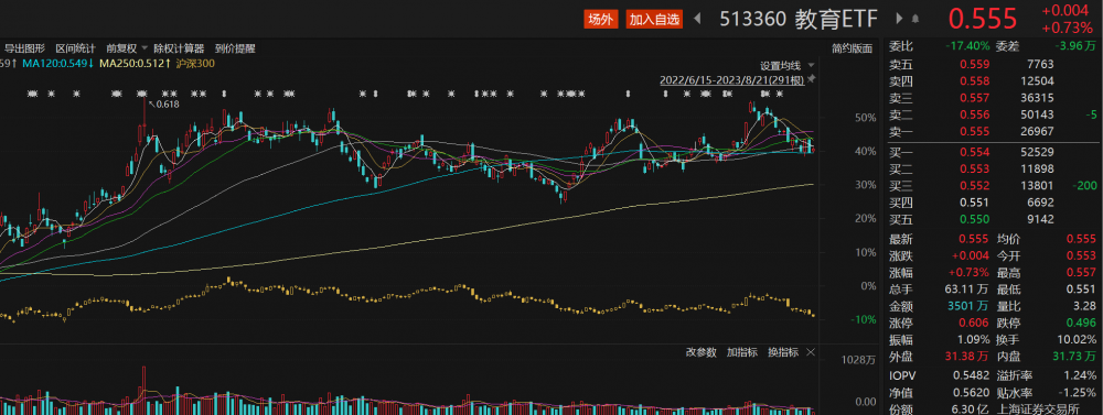 跟踪中证全球中国教育主题指数(931456.CSI)的博时教育ETF(513360)盘中强势,现涨0.73%,溢价率超1%,盘中交投活跃,换手率超10%,成交额突破3500万元。