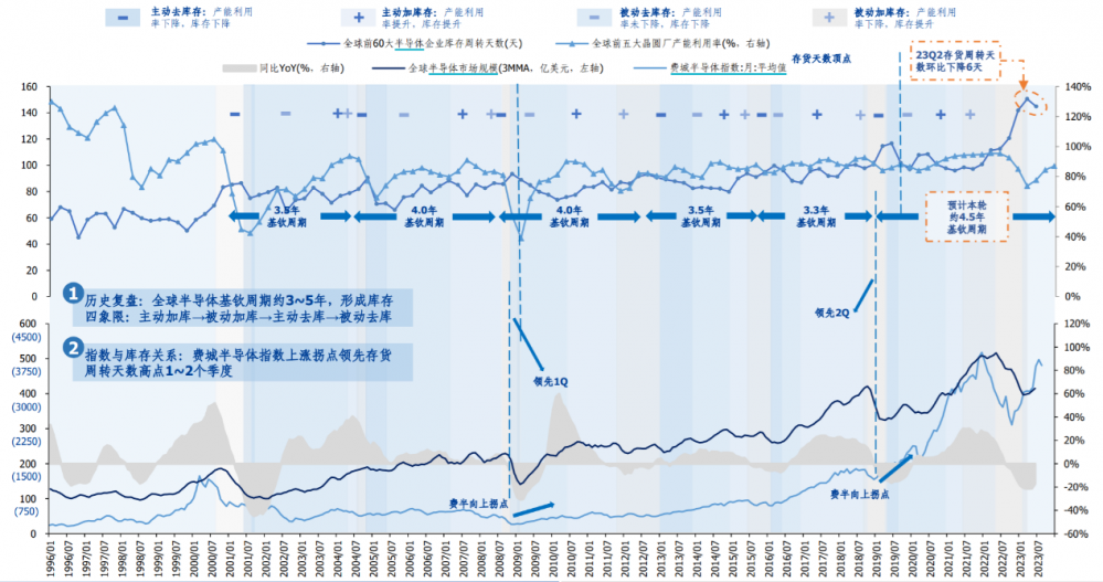 长城证券指出,截至2023年第二季度,全球前60大半导体企业库存周转天数约145天,同比增加32天,环比仅下降6天,说明库存去化速度不及预期。据测算,本轮周期中,半导体库存周转天数或至2024年上半年恢复至90-100天的合理水平。因而2023年四季度,半导体周期复苏预期有望重新演绎。