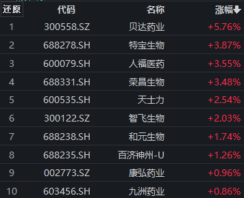 A股医药板块午后反弹。相关指数中,中证创新药产业指数(931152)拉升重新翻红,成分股涨跌互现。截至发稿,上涨成分股中,贝达药业涨近6%,特宝生物、人福医药、荣昌生物涨超3%,天士力、智飞生物、和元生物、百济神州-U、康弘药业、九洲药业等跟涨。