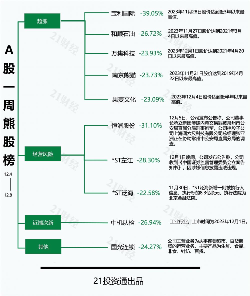 本期十大熊股中,宝利国际(300135.SZ)以39.05%的跌幅成为本期的最熊股。恒润股份(603985.SH)、*ST左江(300799.SZ)、中机认检(301508.SZ)、和顺石油(603353.SH)周跌幅均在25%以上,熊股榜10只个股周跌幅均超22%。