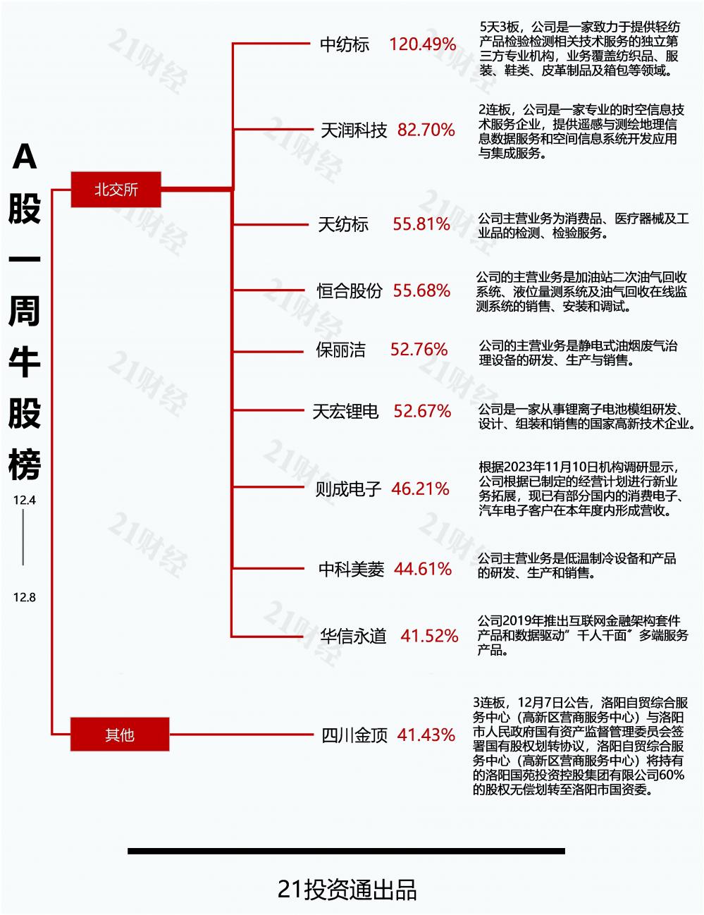 中纺标(873122.BJ)以120.49%的周涨幅夺魁,天润科技(430564.BJ)以82.70%的周涨幅位居第二,天纺标(871753.BJ)、恒合股份(832145.BJ)、保丽洁(832802.BJ)、天宏锂电(873152.BJ)周涨幅均达50%以上,牛股榜10只个股周涨幅均超40%。