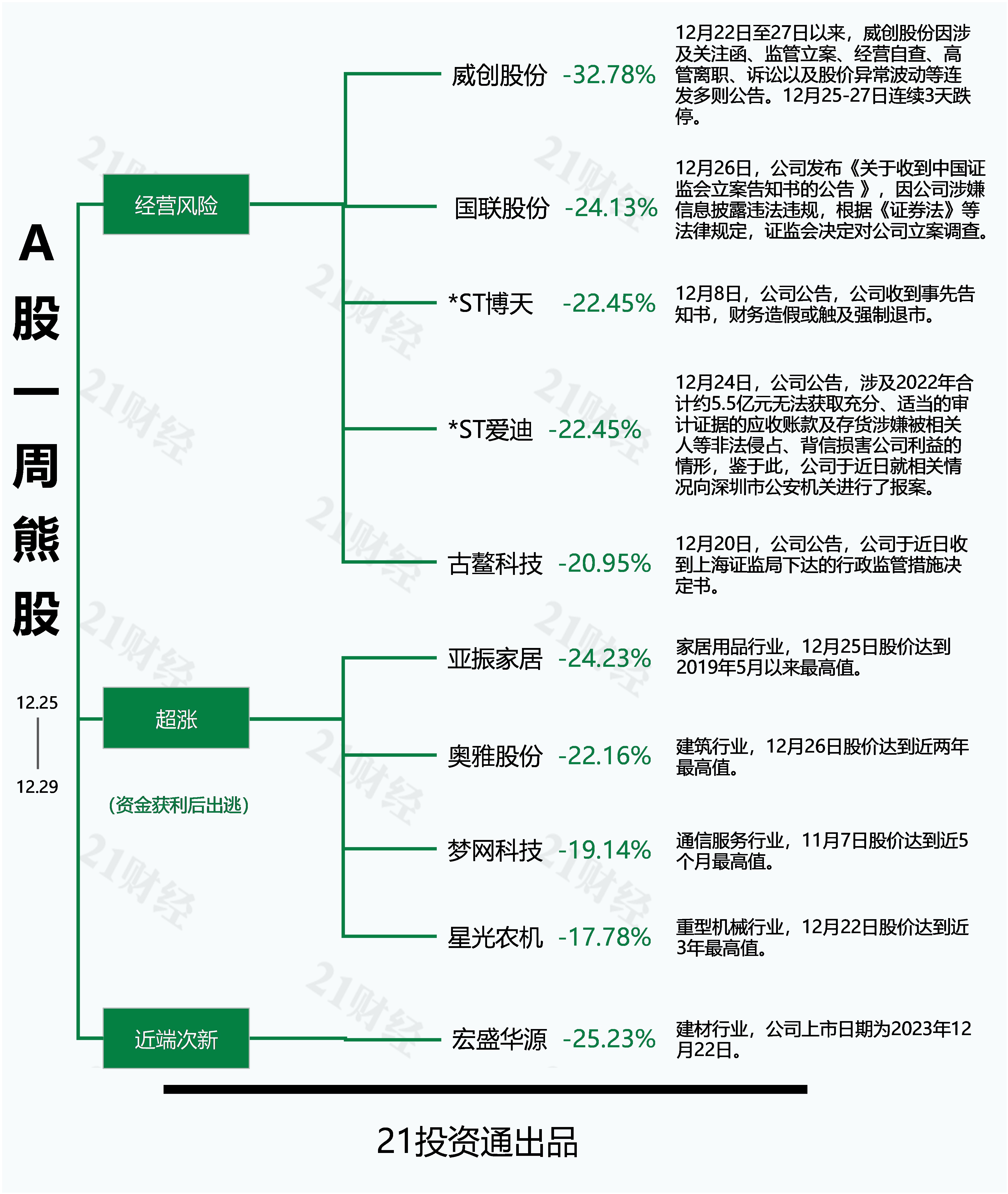 本期十大熊股中,威创股份(002308.SZ)以32.78%的跌幅成为本期的最熊股。宏盛华源(601096.SH)、亚振家居(603389.SH)、国联股份(603613.SH)、*ST博天(603603.SH)、*ST爱迪(002740.SZ)、奥雅股份(300949.SZ)等股的周跌幅均在22%以上。