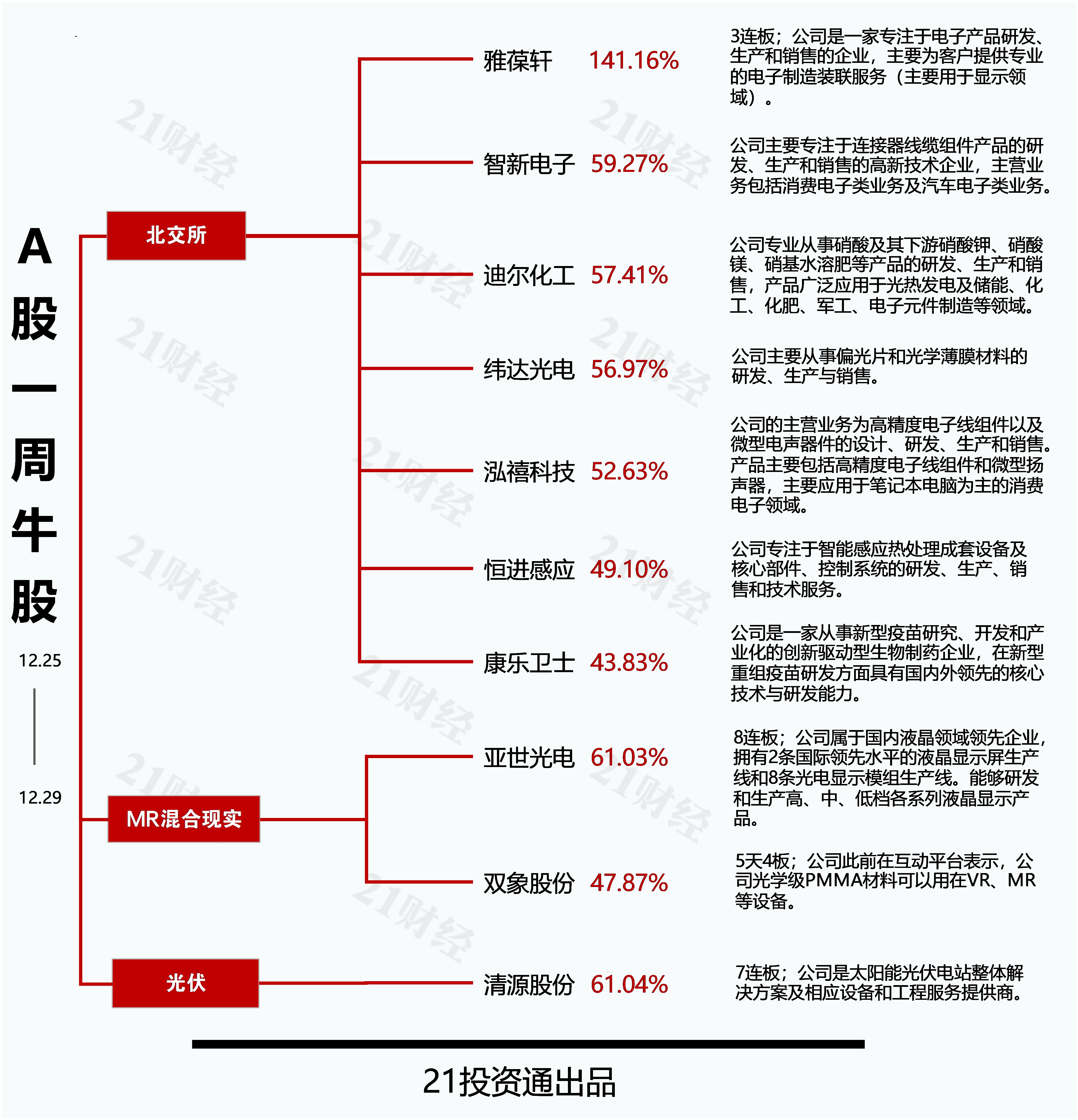 板块方面,光伏板块持续活跃,A股清源股份以61.04%的涨幅登上牛股榜,位列第二。其中12月21日—29日,清源股份斩获7连板,股价区间累计涨幅为94.99%。