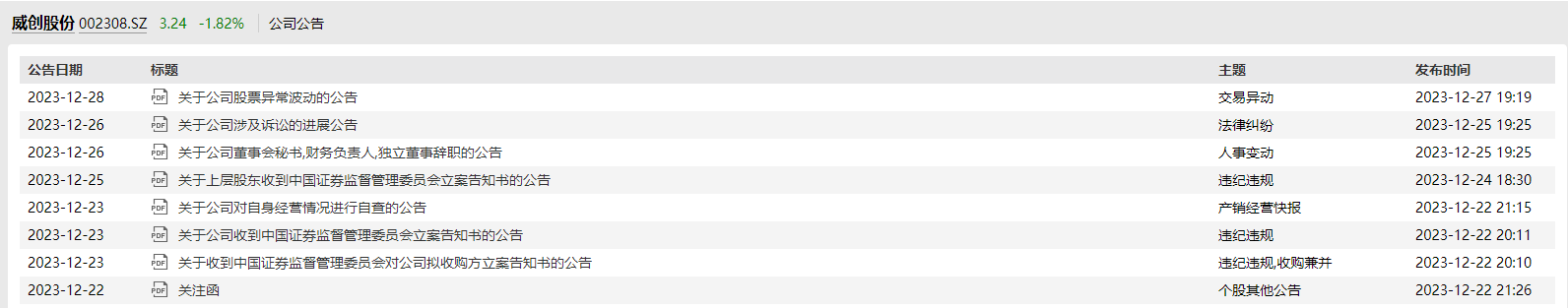 12月22日至27日以来,威创股份因涉及关注函、监管立案、经营自查、高管离职、诉讼以及股价异常波动等连发多则公告,重点内容包括公司及神秘人 “刘钧 ”涉嫌信披违法违规被证监会立案调查;公司 “上层股东”、实控人陆克平因涉嫌信披违法违规被证监会立案;董事会秘书张书晗、财务负责人温晶晶、独立董事张文栋等多人辞职。