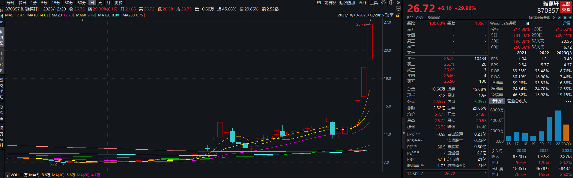 Wind金融终端显示,12月29日,雅葆轩股价收30cm涨停,报26.72元/股,创上市北交所一年以来最高价;日换手率达到45.68%。12月27—29日连收3个30cm涨停。
