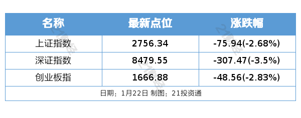 1月22日,市场全天低开低走,三大指数均跌超2%再创调整新低,沪指收盘失守2800点。此外中证1000指数跌超5%,中证1000期指多个远期合约盘中触及跌停。截至收盘,沪指跌2.68%,深成指跌3.5%,创业板指跌2.83%。板块方面,无上涨板块,拼多多、传媒、数据要素、鸿蒙概念等板块跌幅居前。总体上个股跌多涨少,全市场近5200只个股下跌,上涨个股不足200只,逾200股跌超9%。沪深两市成交额7940亿,较上个交易日放量1274亿。
