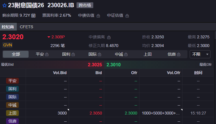 10年期国债到期收益率仍旧在下行。iFind数据显示,10年期国债活跃券“23附息国债26”收益率跌至2.31%附近。