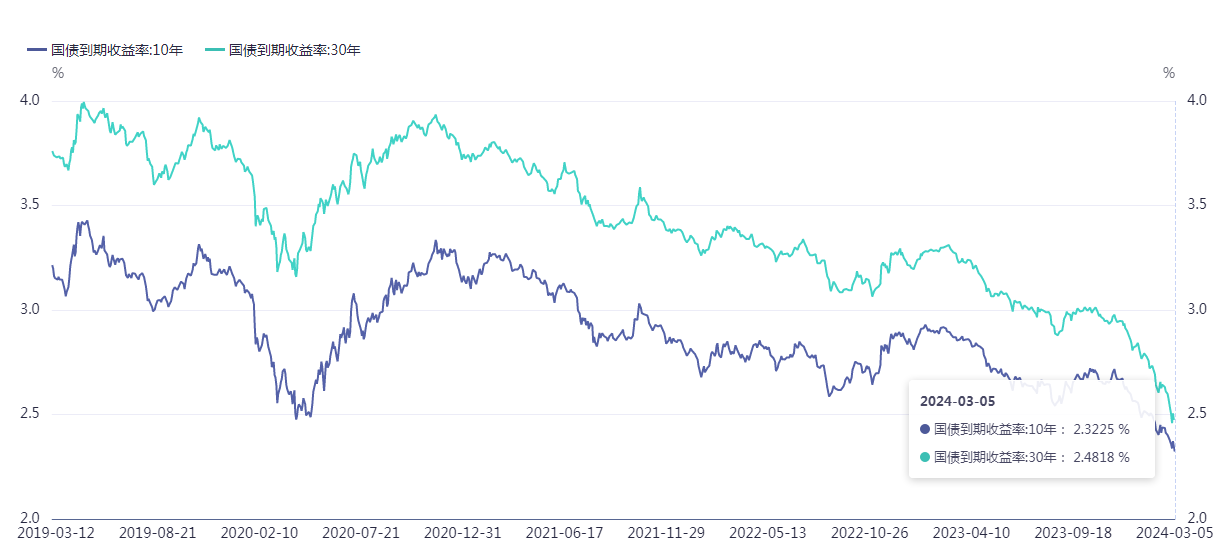与此同时,十年期、三十年期国债到期收益率下跌。截至3月5日,10年期和30年期国债收益率分别一度下行至2.32%和2.48%。其中,10年期国债到期收益率持续创阶段新低,30年期国债到期收益率2月29日创下阶段新低后略有回升。