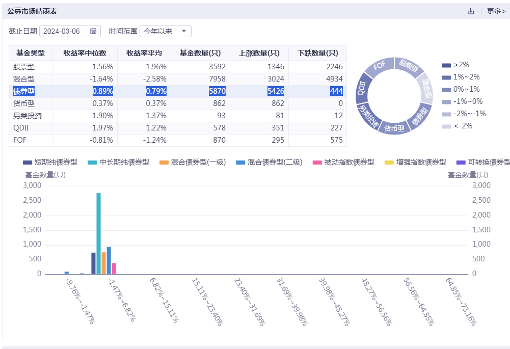 数据显示,今年来超5400只债券型基金(包括各类份额,下同)上涨。截至3月5日,有超2000只债基的复权单位净值创新高。有超过200只债基今年来复权单位净值增长率(回报率)超过2%,近20只债基今年来收益率跑赢沪深300指数。