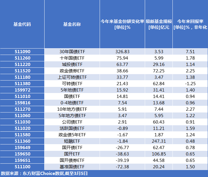 值得一提的是,30年期、10年期国债到期收益率持续下跌,让对应的债券ETF后“吸金”能力大增。截至3月5日,今年来30年国债ETF(511090)今年来基金份额增长近超300%,十年国债ETF(511260)基金份额增长76%。