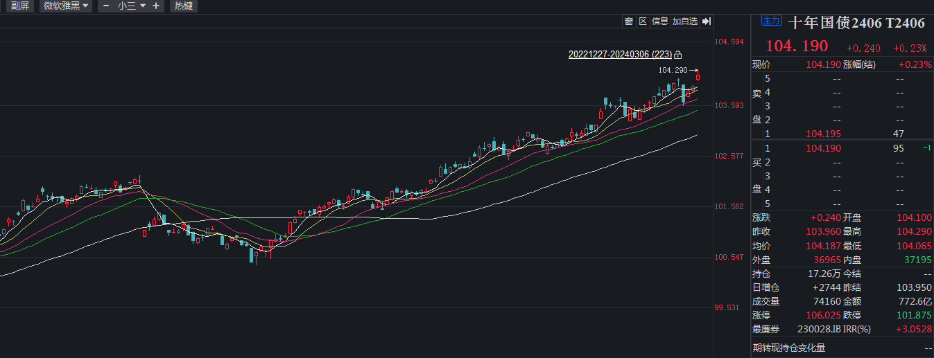 行情似乎还未结束,3月6日,国债期货持续走高,其中10年期主力合约盘中触及104.29续创历史新高。同时,10年期国债活跃券“23附息国债26”收益率跌至2.31%附近。