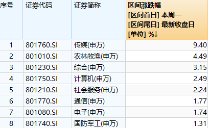 具体来看,52%的个股周内实现上涨,196只个股周涨超15%,9只个股跌幅超过15%。传媒、农林牧渔、计算机、社会服务、通信等板块涨幅居前,建筑材料、医药、有色金属、家电等板块领跌。