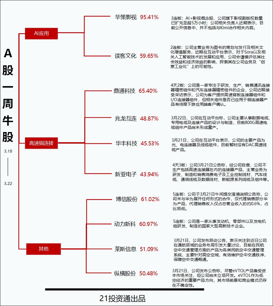 本期牛股榜中,华策影视(300133.SZ)以95.41%的周涨幅夺魁,公司股价从3月20日至22日连收3个“20CM”涨停板,排名第二的是鼎通科技(688668.SH),以65.40%的涨幅紧随其后,博信股份(600083.SH)和动力新科(600841.SH)的周涨幅也均在60%以上。值得注意的是,本期十大牛股的涨幅均在40%以上。