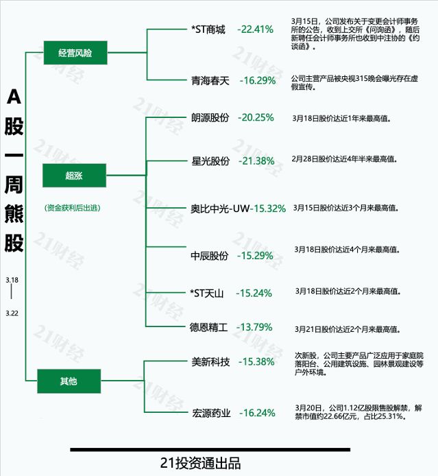 本期十大熊股中(剔除近一周上市的次新股),*ST商城(600306.SH)周跌幅为22.41%,星光股份(002076.SZ)、朗源股份(300175.SZ)跌幅均在20%以上。青海春天(600381.SH)和宏源药业(301246.SZ)分别跌16.29%和16.24%。本周熊股榜10只个股周跌幅均超13%。
