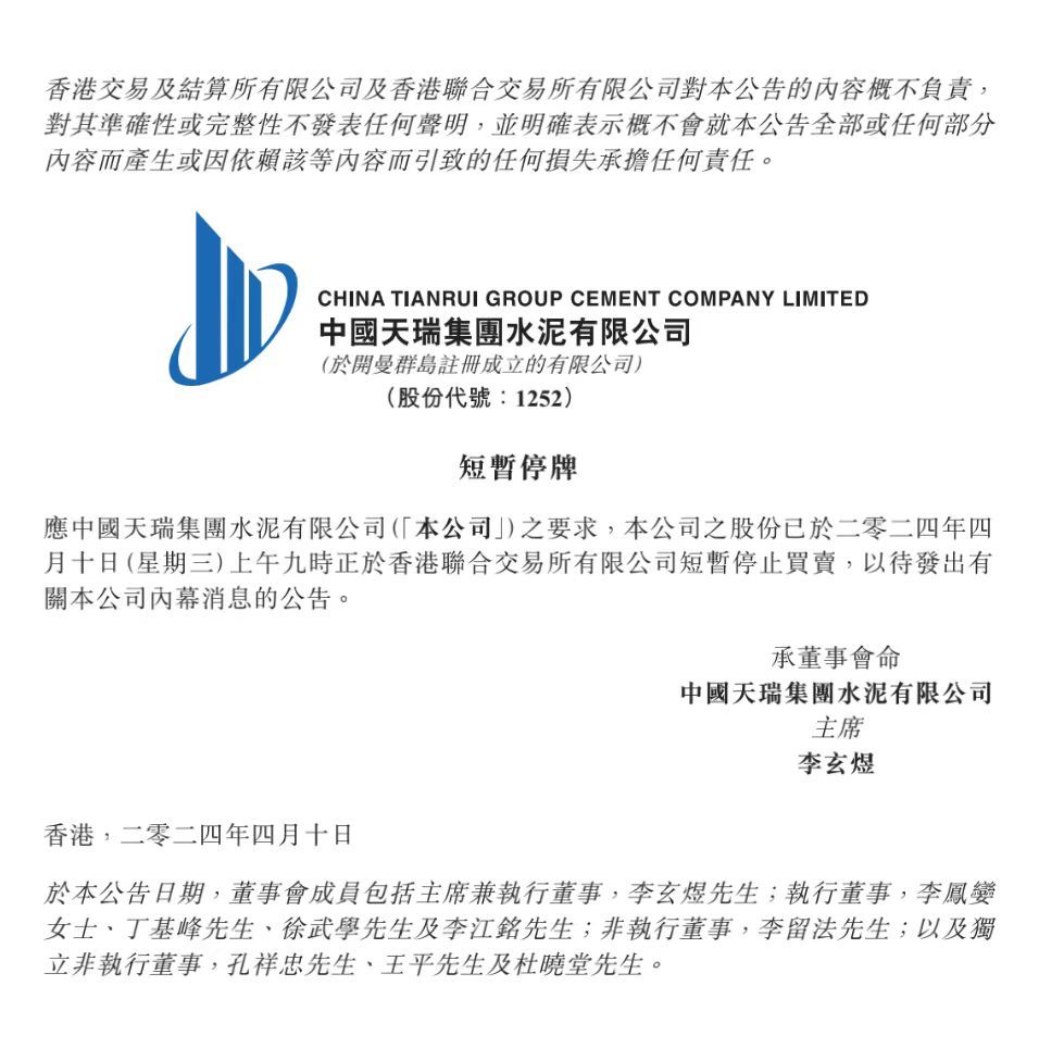 4月10日,中国天瑞水泥(01252.HK)在港交所公告,于今天上午九时起短暂停止买卖,以待发出有关公司内幕消息的公告。
