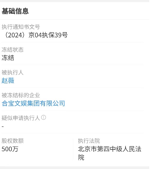 4月16日,南财快讯记者注意到,赵薇新增一条持有股权被冻结信息,被冻结标的企业为合宝文娱集团有限公司,股权份额为500万元,执行法院为北京市第四中级人民法院,冻结期限自2024年4月11日至2027年4月10日。