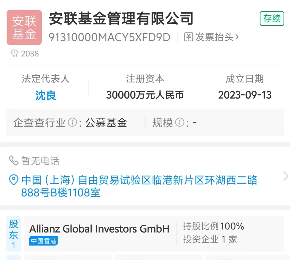 企查查显示,安联基金注册资本为3亿元,由安联投资100%控股。安联投资是安联(中国)保险控股有限公司子公司,后者是中国首家外资独资保险控股公司。