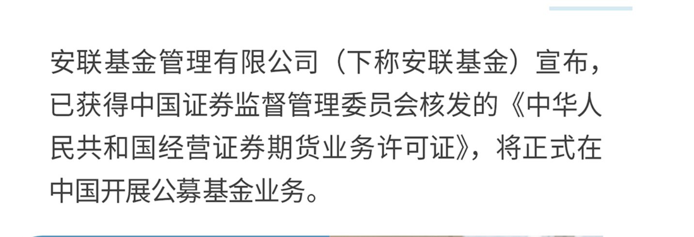 4月18日晚,安联投资官方账号“官宣”,安联基金管理有限公司(下称安联基金)已获得中国证券监督管理委员会核发的《中华人民共和国经营证券期货业务许可证》,将正式在中国开展公募基金业务。