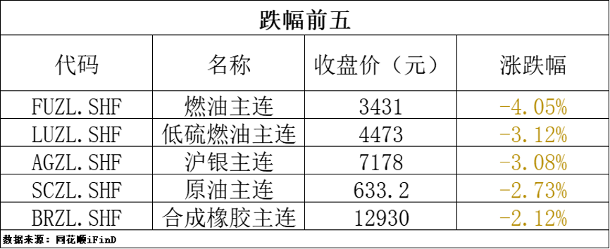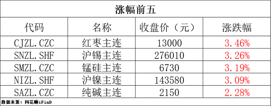 4月22日收盘,国内期货主力合约涨跌不一,锰硅、红枣、沪镍、沪锡涨超3%,纯碱涨超2%,玻璃、烧碱、硅铁涨超1%;跌幅方面,燃油跌超4%,沪银、低硫燃料油跌超3%,原油、丁二烯橡胶(BR)、氧化铝跌超2%。
