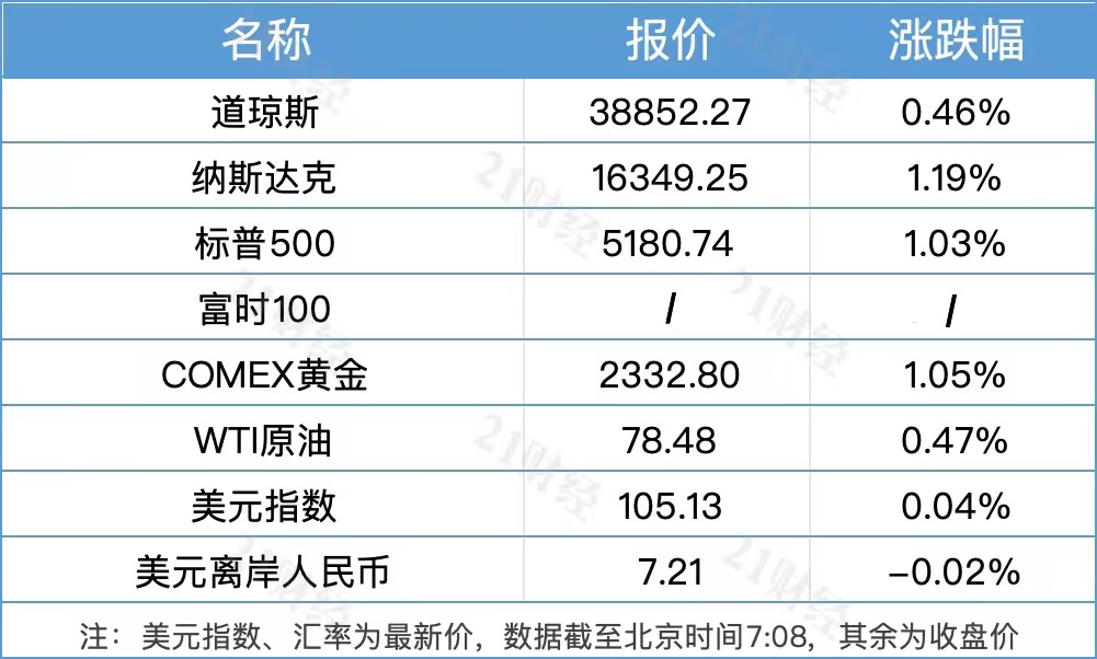 纽约股市三大股指6日上涨。截至当天收盘,道琼斯工业平均指数比前一交易日上涨176.59点,收于38852.27点,涨幅为0.46%;标准普尔500种股票指数上涨52.95点,收于5180.74点,涨幅为1.03%;纳斯达克综合指数上涨192.92点,收于16349.25点,涨幅为1.19%。