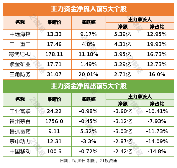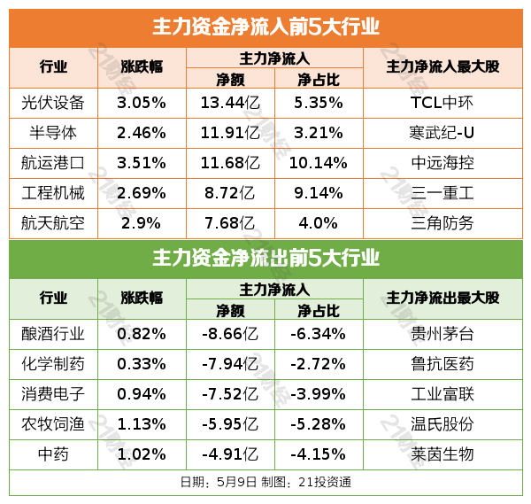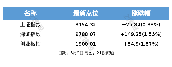 5月9日,市场全天震荡反弹,创业板指领涨,沪指、深成指均再创年内新高。截至收盘,沪指涨0.83%,深成指涨1.55%,创业板指涨1.87%。板块方面,航运、电力设备、军工、细胞免疫治疗等板块涨幅居前,染料、ST板块、合成生物、教育等板块跌幅居前。总体上个股涨多跌少,全市场超4200只个股上涨。沪深两市成交额9011亿,较上个交易日放量367亿。