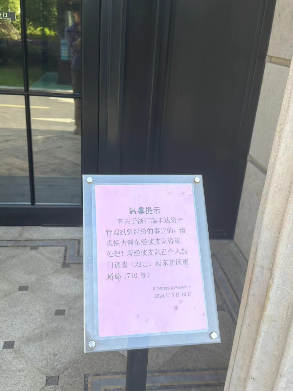 5月10日,记者来到浙江瑞丰达资产管理有限公司(下称“瑞丰达”)上海办公地浦东新区北蔡镇五星路727弄汇公馆10号楼,发现门口立有汇公馆物业客户服务中心放置的标识,上面写着“有关于浙江瑞丰达资产管理投资纠纷的事宜的,请直接去浦东经侦支队咨询处理!现经侦支队已介入封门调查”。