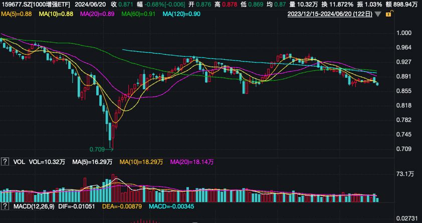 相关ETF方面,1000增强ETF(159677)截至发稿跌0.68%。成交额超900万元,换手率近12%,盘中交投活跃。