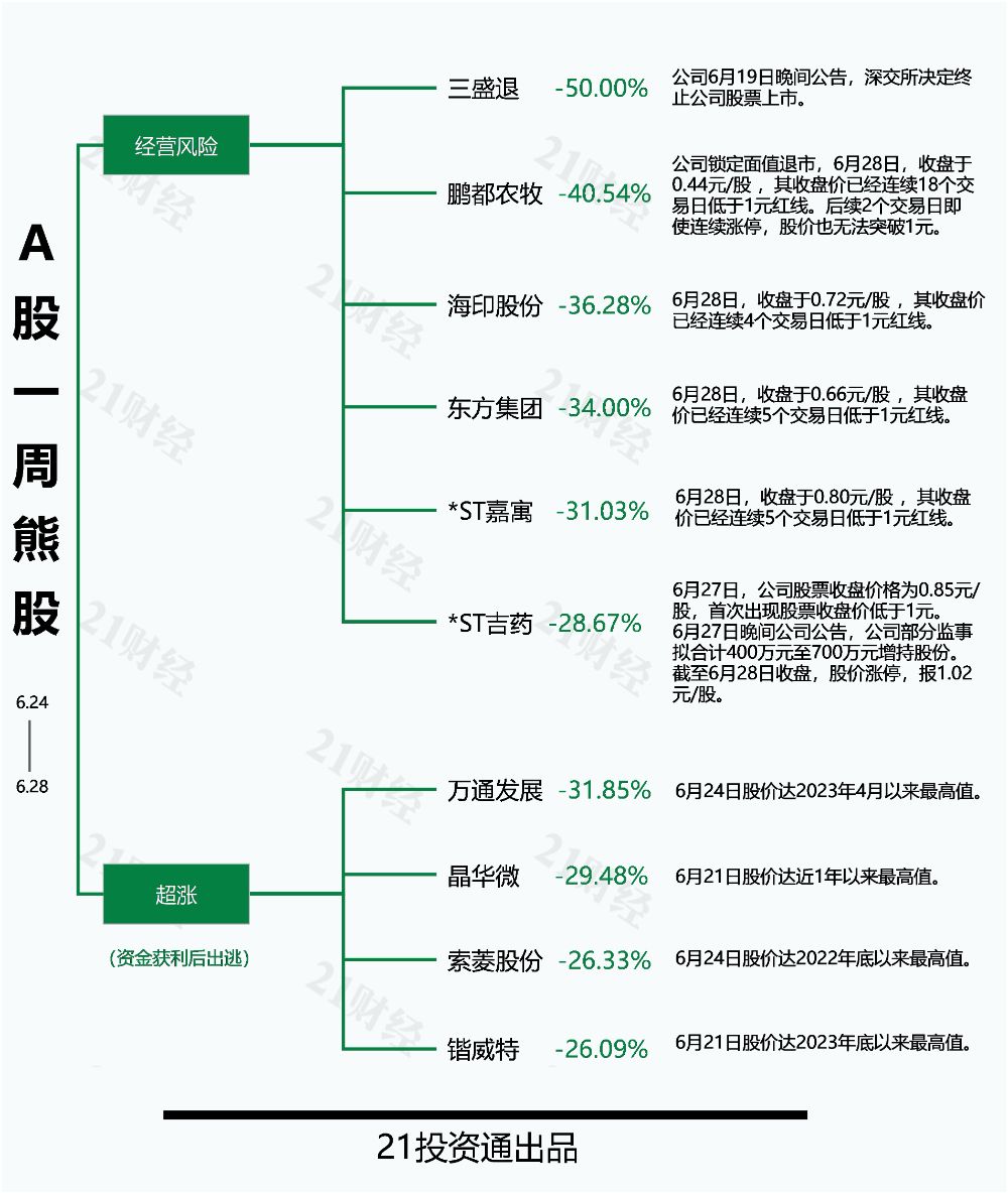 本期十大熊股中,三盛退(300282.SZ)以50.00%的跌幅成为本期的最熊股。鹏都农牧(002505.SZ)、海印股份(000861.SZ)、东方集团(600811.SH)、万通发展(600246.SH)、*ST嘉寓(300117.SZ)等股的周跌幅均在26%以上。