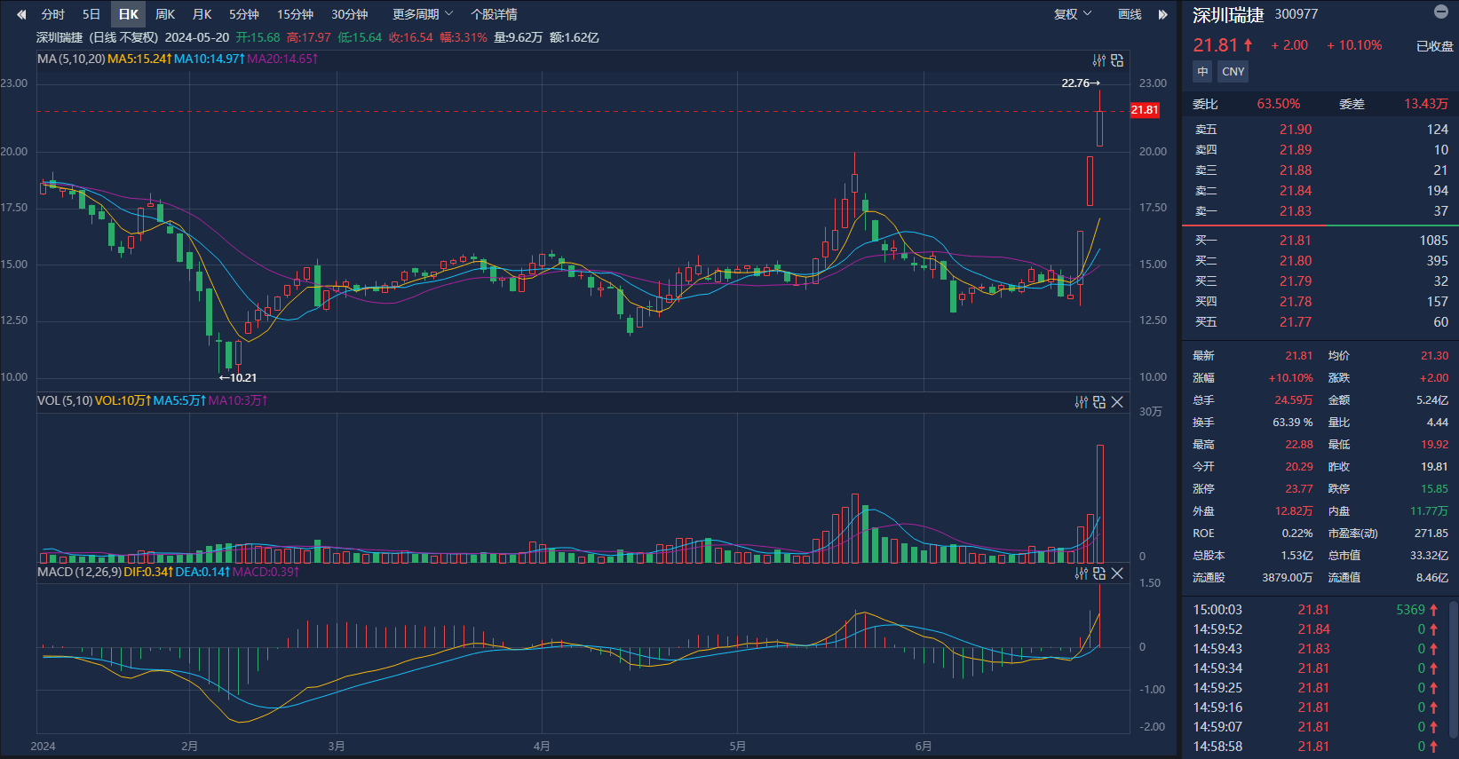 值得注意的是,6月24日—28日,深圳瑞捷获主力资金净流入4369.04万元。其中,截至6月27日收盘,获主力资金净流入4603.36万元,净流入额创2021年6月21日以来新高,连续3日净流入。