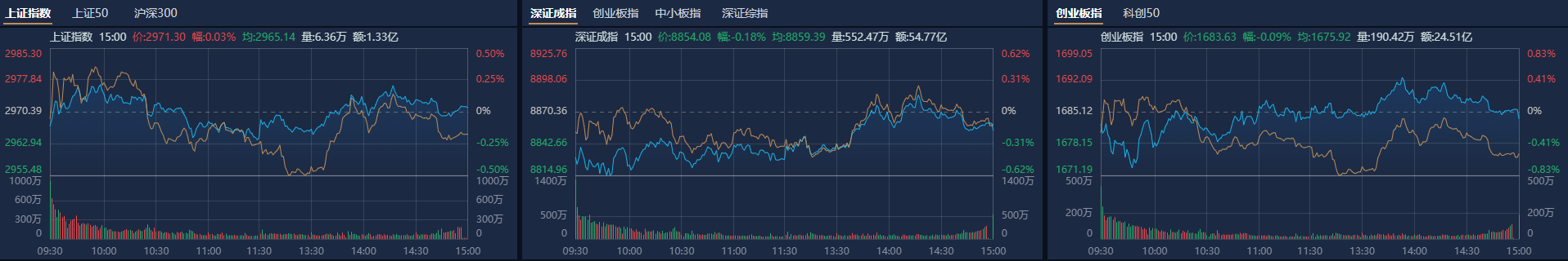市场全天窄幅震荡,三大指数涨跌不一。南财金融终端显示,截至收盘,沪指涨0.03%,深成指跌0.18%,创业板指跌0.09%。