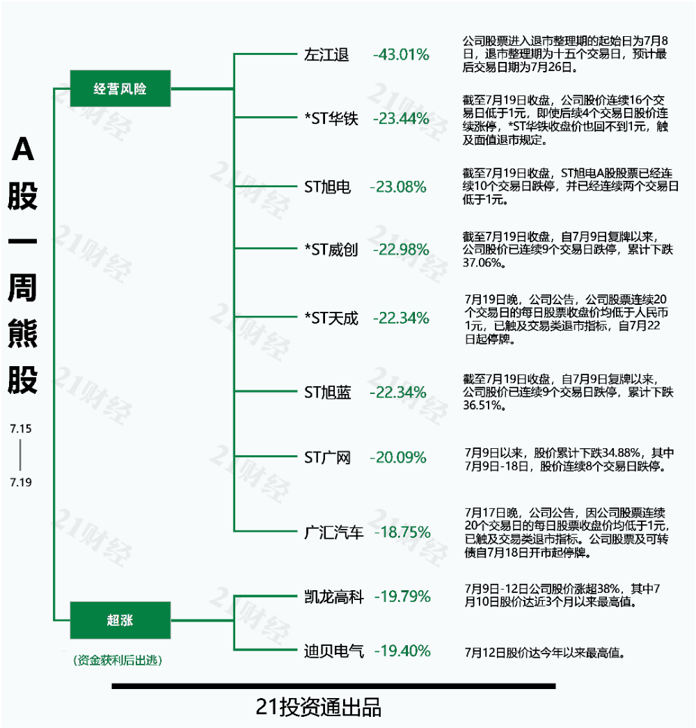 值得注意的是,此前一期(7月8日—7月12日),左江退就曾上榜成为最熊股。相关链接(透视一周牛熊股:无人驾驶概念爆发,最牛股天迈科技周内涨近69%;昔日“最贵ST股”进入退市整理期,左江退周跌超70%)