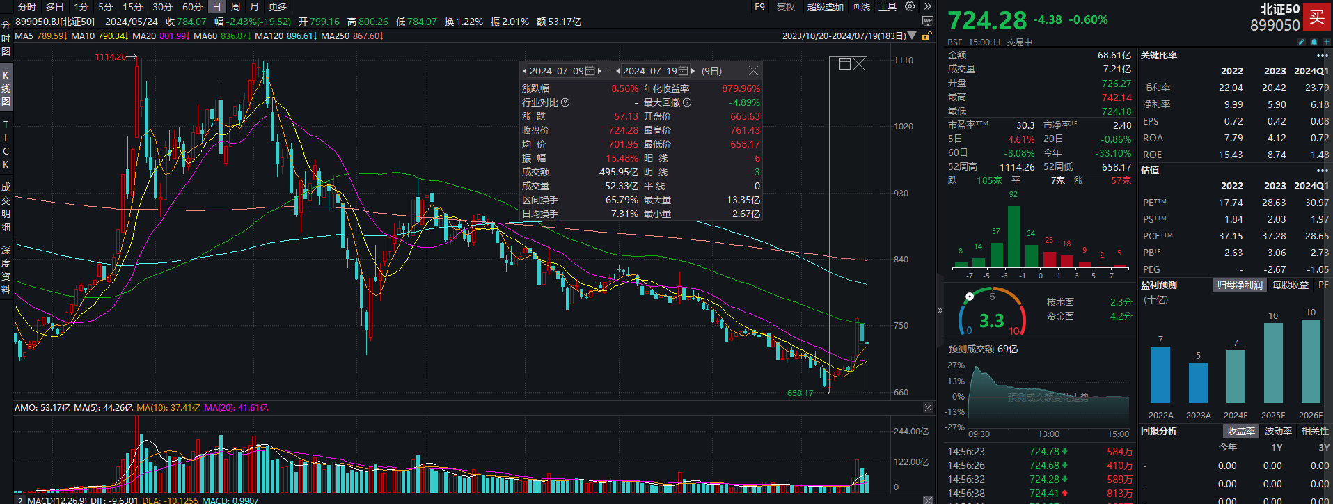 指数方面,北证50指数于7月9日盘中达历史最低点后开始反弹,截至7月19日收盘,累计9个交易日涨超8%。