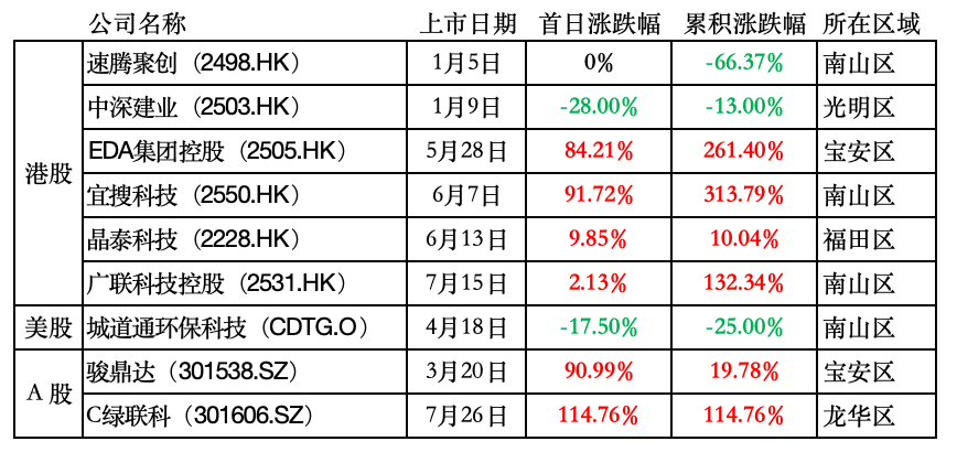 此外,福田区、光明区及龙华区也各有企业成功上市。其中,?中深建业为光明区本土培育的第一家上市建筑业企业。虽受行业大环境影响,首日收跌,但在过去半年中已呈现缓慢回升趋势。