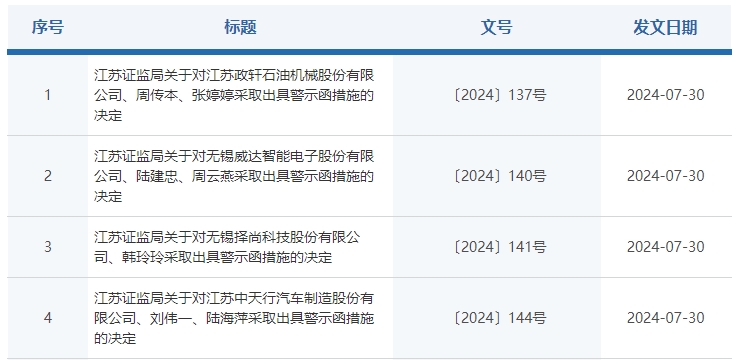 7月30日,因未按照规定时间出具2023年年报,江苏证监局拟对四家挂牌公司及时任高管采取出具警示函措施的决定。