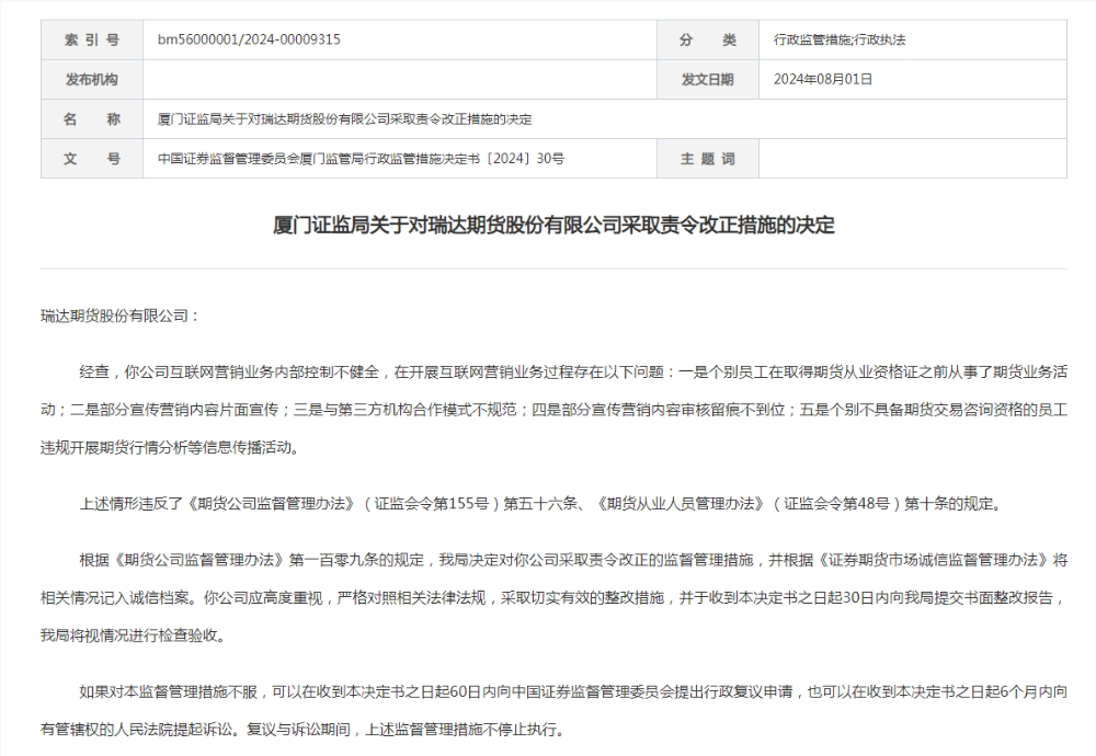决定书显示,经查,瑞达期货的互联网营销业务内部控制不健全,在开展互联网营销业务过程存在以下问题: