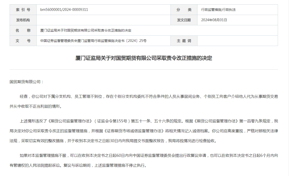 厦门证监局决定对国贸期货采取责令改正的监管措施,并将相关情况记入诚信档案。
