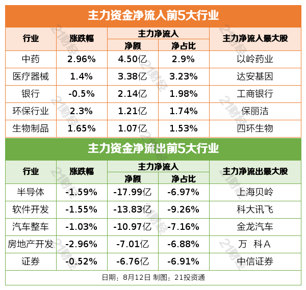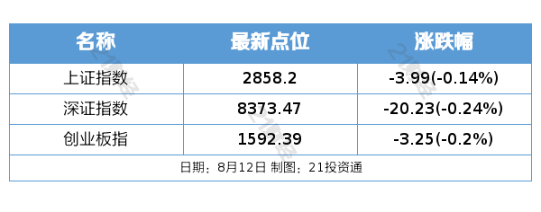 8月12日,市场全天震荡调整,三大指数均小幅下跌。截至收盘,沪指跌0.14%,深成指跌0.24%,创业板指跌0.2%。沪深两市成交额4959亿元,较上个交易日缩量672亿元,成交额跌破5000亿元,创2020年5月25日以来新低。总体上个股跌多涨少,全市场超3600只个股下跌。板块方面,环保设备、新冠药、中药、油气等板块涨幅居前,教育、房地产、旅游、ST板块等板块跌幅居前。