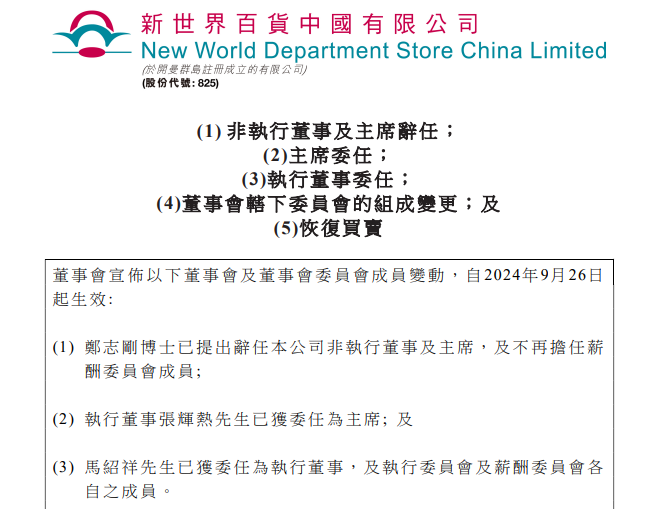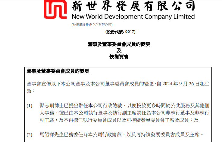 9月26日,新世界发展(00017.HK)发布公告称,郑志刚已辞任该公司行政总裁,新世界首席营运总监马绍祥已获委任为行政总裁。