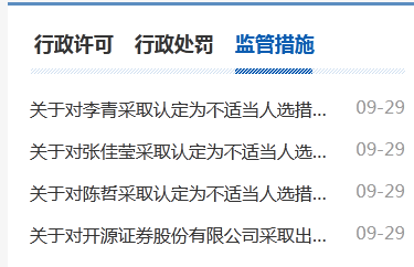 陕西证监局决定对开源证券采取出具警示函的行政监管措施。开源证券的三位员工李青、张佳莹、陈哲也被采取处罚措施。