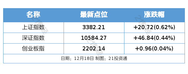 12月18日,市场全天冲高回落,三大指数小幅上涨。截至收盘,沪指涨0.62%,深成指涨0.44%,创业板指涨0.04%。沪深两市全天成交额1.36万亿,较上个交易日缩量1498亿。