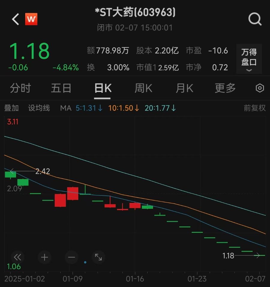 实际上,*ST大药早已跌为“一元股”。截至2月7日收盘,公司下跌4.84%,报每股1.18元,总市值为2.59亿元。