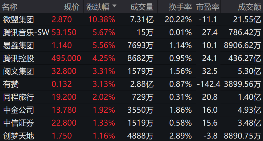 2月17日,港股腾讯概念股早盘纷纷走高,截至午间收盘,腾讯控股(0700.HK)收涨4.25%。微盟集团(02013.HK)涨超10%、腾讯音乐-SW(1698.HK)涨5.67%、阅文集团(00772.HK)涨3.31%。