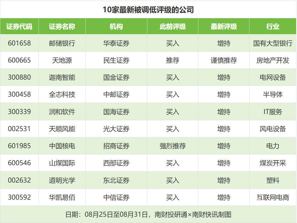 评级调低方面,8月25日至8月31日,券商调低上市公司评级达到44家次,最新数据包括了华泰证券对邮储银行的评级从“买入”调低至“增持”,民生证券对天地源的评级从“推荐”调低至“谨慎推荐”,国金证券对迦南智能的评级从“买入”调低至“增持”。
