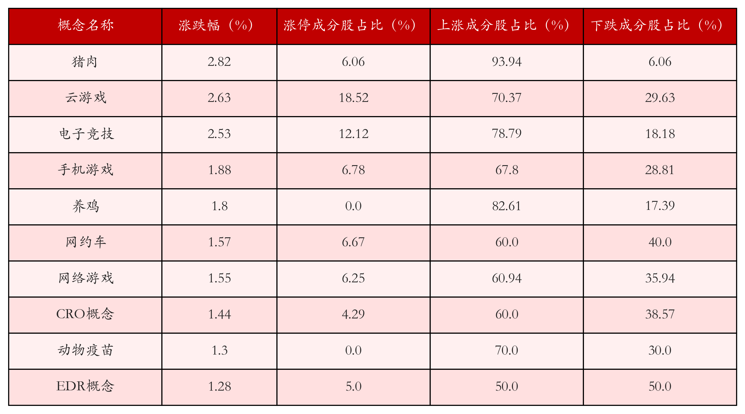 根据A股概念涨跌幅与所对应的股票池综合分析,涨幅靠前的三个概念板块分别为:猪肉、云游戏与电子竞技。排名前10位的概念板块相关数据见下表: