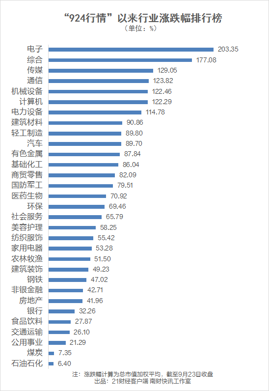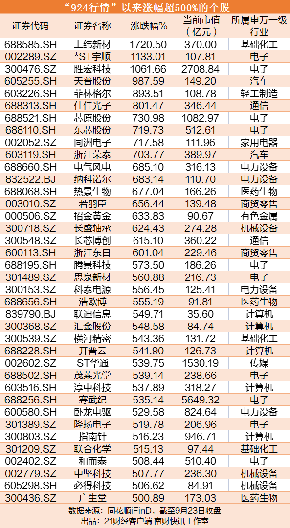 从个股表现来看,剔除“924”后上市新股后,本轮行情共有5137只个股上涨,占比超九成,1431只个股实现翻倍,38只个股涨幅超500%。其中,3只个股实现10倍以上涨幅,分别为上纬新材(1720.5%)、*ST宇顺(1133.01%)、胜宏科技(1061.66%),分别隶属基础化工、电子行业。