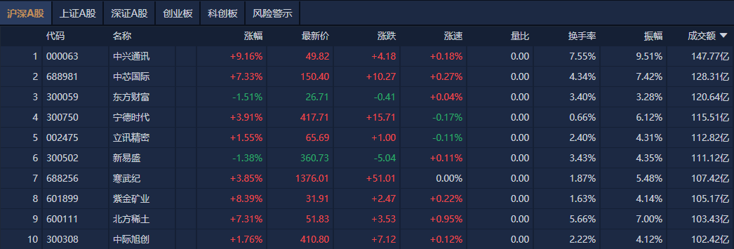 个股方面,中兴通讯成交额超147亿元居首,中芯国际、东方财富、宁德时代成交额靠前。