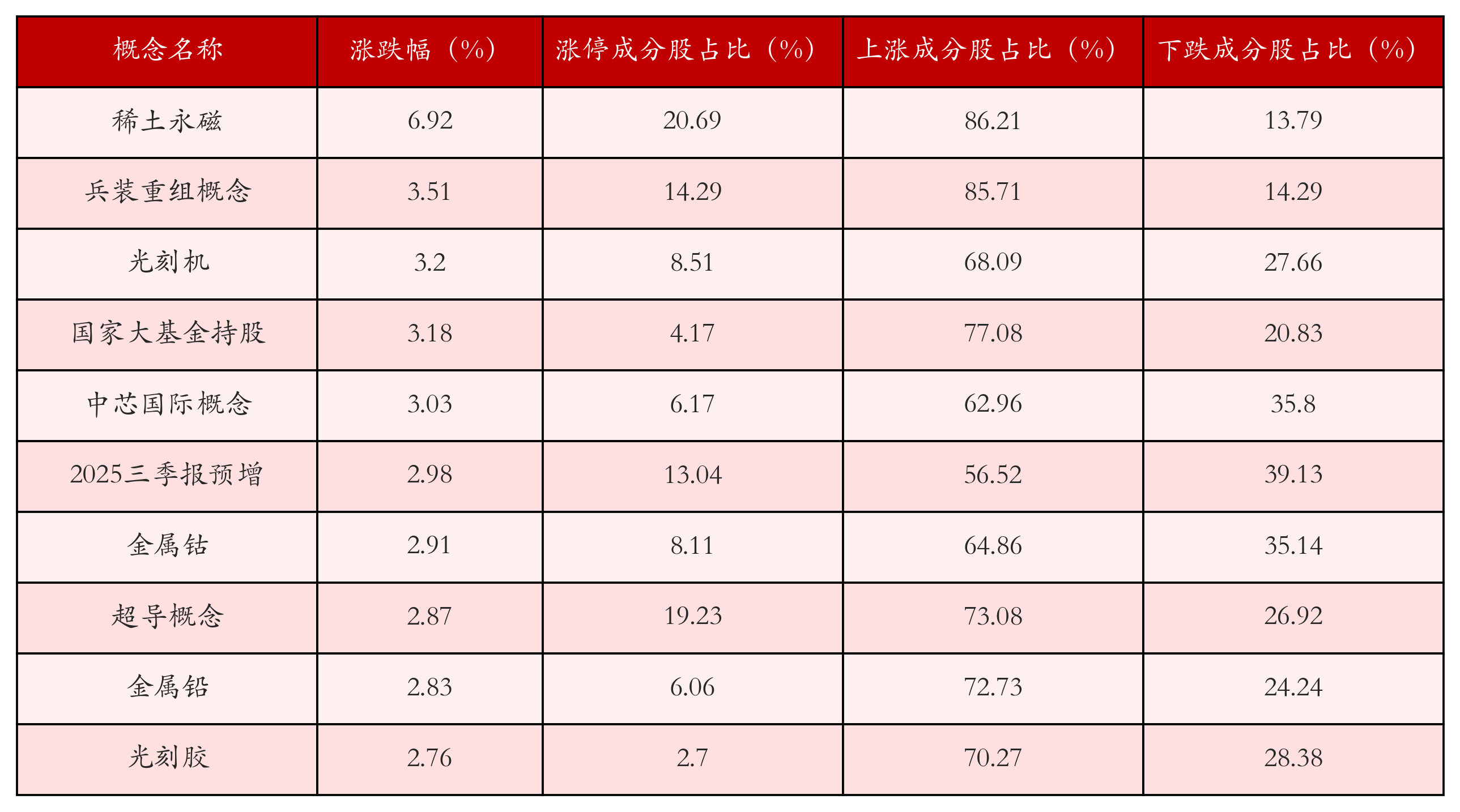 根据A股概念涨跌幅与所对应的股票池综合分析,涨幅靠前的三个概念板块分别为:稀土永磁、兵装重组概念与光刻机。排名前10位的概念板块相关数据见下表:
