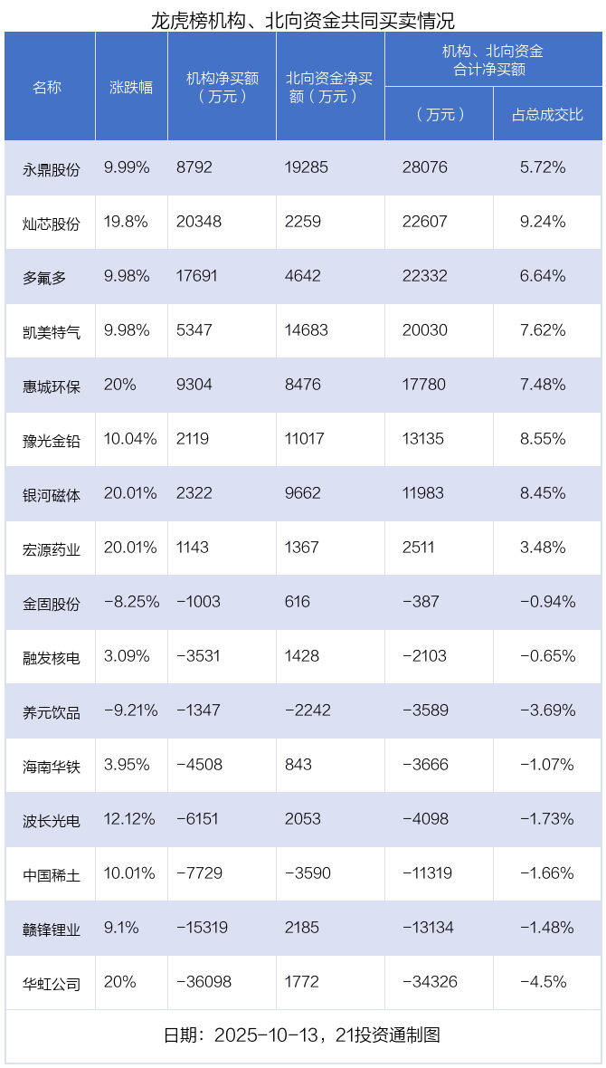 10月13日,36只个股龙虎榜出现了机构的身影,机构合计净买入3.59亿元。具体来看,机构净买入22股,净卖出14股。