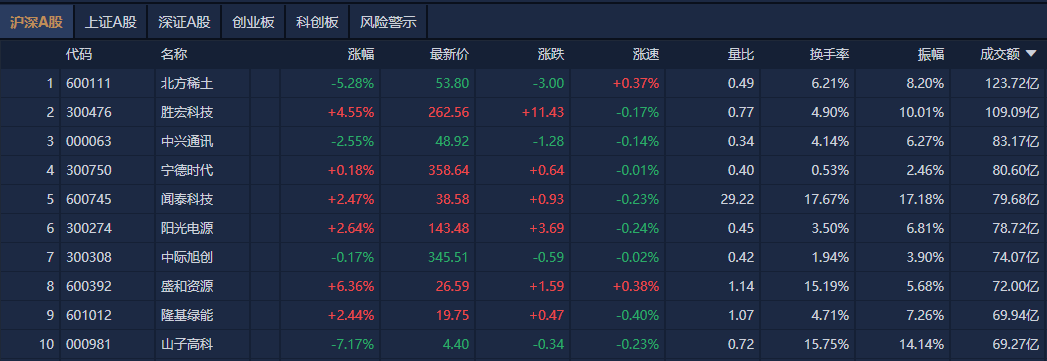 个股方面,北方稀土成交额超123亿元居首,胜宏科技、中兴通讯、宁德时代成交额靠前。
